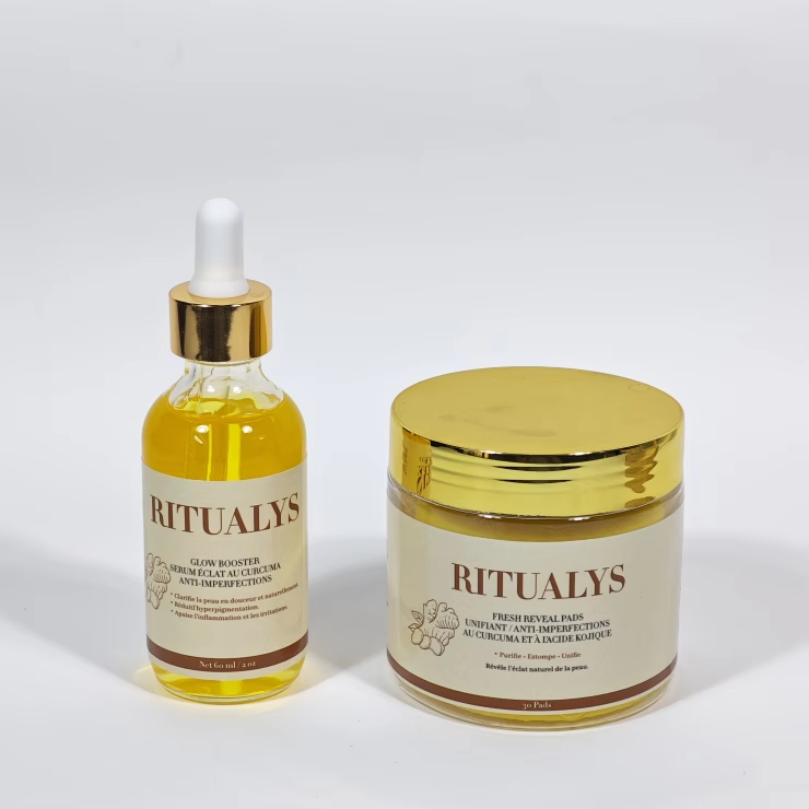 Ritualys agit là où tout commence: inflammation, déséquilibre de la peau, hyperpigmentation, boutons. Jour après jour nos soins à base de curcuma, acide kojique, niacinamide, et acides lactiques hydratant, aident ta peau à s'apaiser, purifier les imperfections, atténuer les taches et réveiller l'éclat sans agresser ta peau.